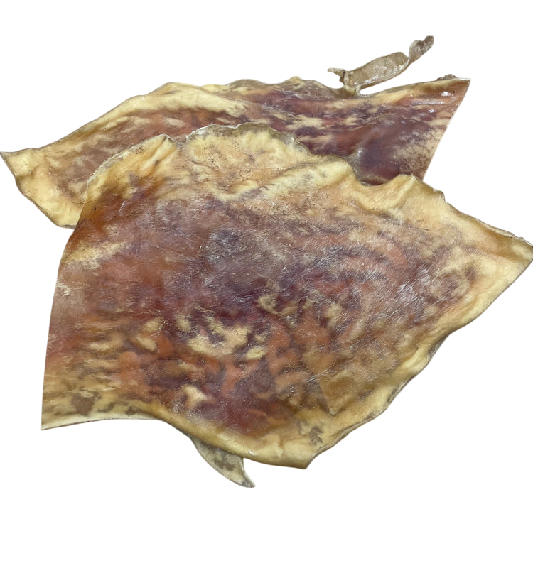 De runderkophuid platen zijn in een mooie maat gezaagd van 25x30cm en dus voor alle honden geschikt die erg graag kauwen.